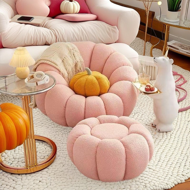 One of our standout offerings is the Pumpkin Pouf and Chair Lounge Set. This ensemble melds whimsy with comfort, featuring plush, textured upholstery in a charming soft pink hue. The unique pumpkin shape of the chair, accented with a playful orange cushion for added lumbar support, promises a delightful seating experience. Paired with a matching ottoman, this leisure chair set is the epitome of modern sophistication and comfort. Complementing the playful aesthetic is a quirky polar bear side table, perfect for serving beverages and snacks—a playful yet elegant addition to your living space.
