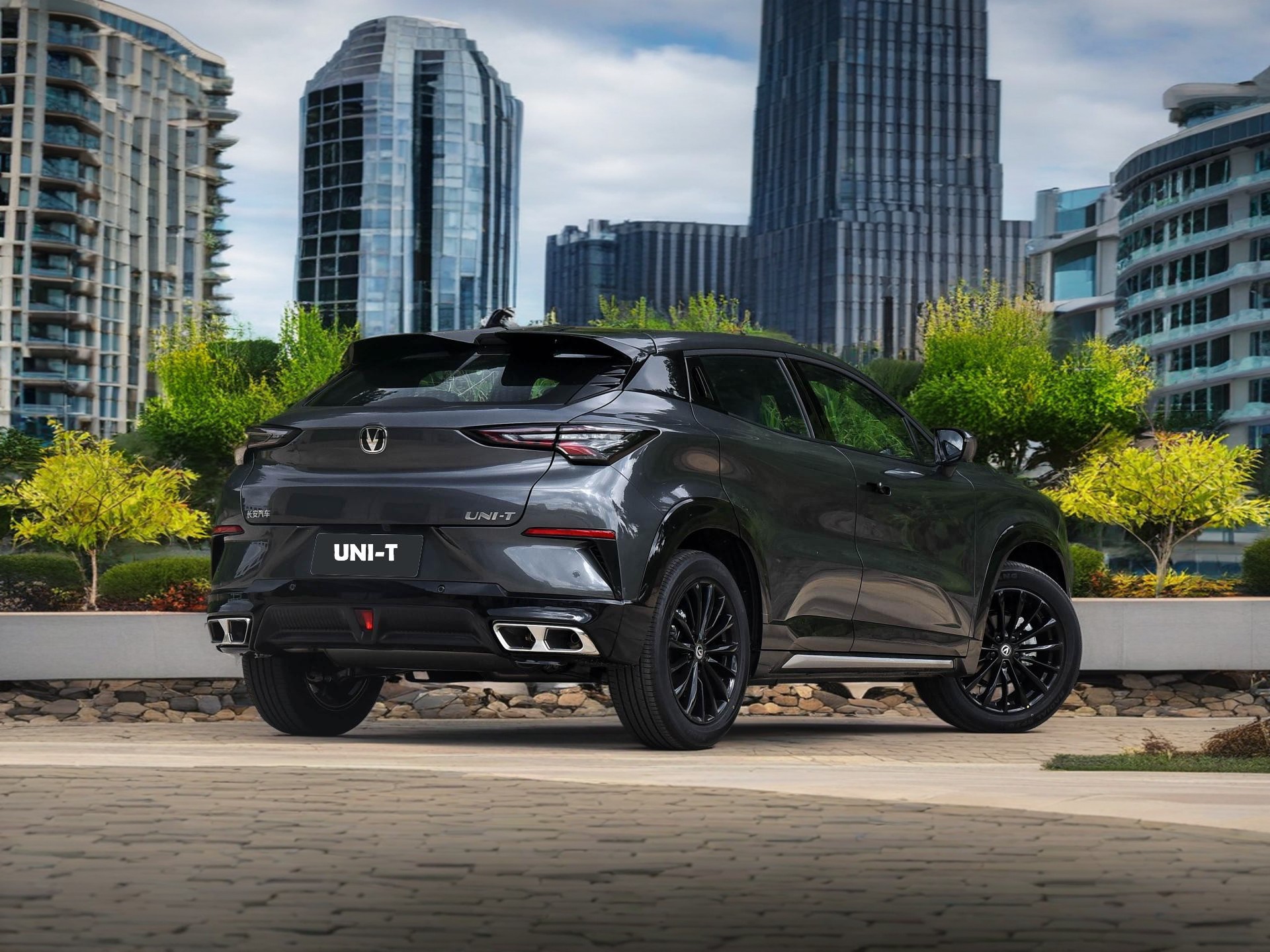 Each aspect of the Changan Uni T speaks to its high-performance capabilities and luxurious comfort. At the rear, the distinctively designed tail lights boast sharp, angular lines, presenting a high-tech aesthetic that exudes movement, even when the car is stationary. The bold double exhausts integrated seamlessly into the rear bumper are not just about style; they hint at the powerful performance potential hidden beneath the surface. Add in the black alloy wheels, which assure robust performance and durability, and you have a vehicle that not only promises a powerful drive but adds an edge of style to its overall presence on the road.