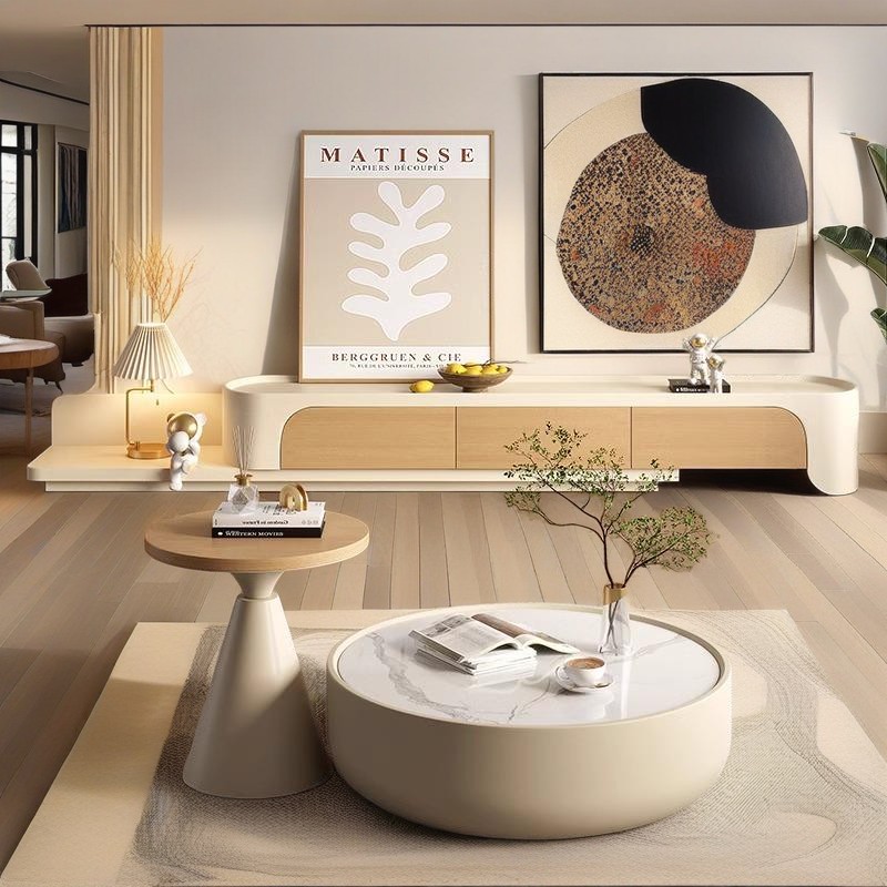 The marble coffee table is flawlessly complemented by a low-line TV console. Reflecting a modern Scandinavian aesthetic, the warm wooden tones and rounded edges of the console serve as understated companions to the opulent coffee table. And it doesn’t stop there. Adding abstract framed artwork injects a cultural and refined touch to your space. Engaging decorative sculptures and strategically placed greenery breathe life and enthusiasm into the decor, making the space not just visually appealing but also reflecting a vibrant lifestyle.