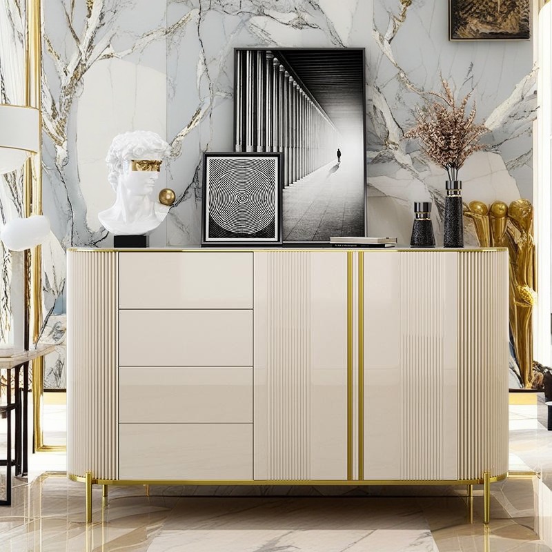 An entrance hall cabinet is not just about providing a functional space to store your daily essentials; it is also a key piece of decor that can significantly elevate the aesthetic appeal of your home. The epitome of modern elegance comes to life in this sleek, high-glass sideboard, gracefully adorned with opulent gold accents. This masterful piece is not simply furniture—it is an art statement in sophistication and style.