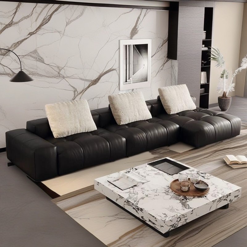 One of the standout features of our offerings is the luxurious black leather sectional sofa. This modern sofa is not just about aesthetic appeal; it’s engineered for supreme comfort with deep, plush cushions that are perfect for relaxation. The sleek design is accentuated by soft, textured pillows that add layers of comfort and sophistication, ensuring that your sofa is the perfect retreat after a long day.