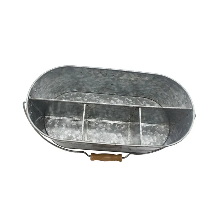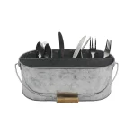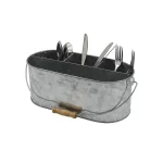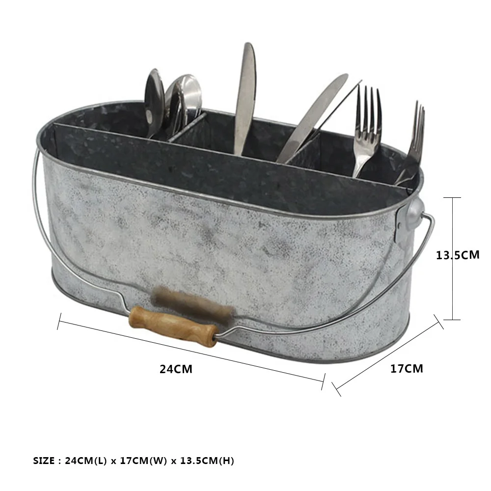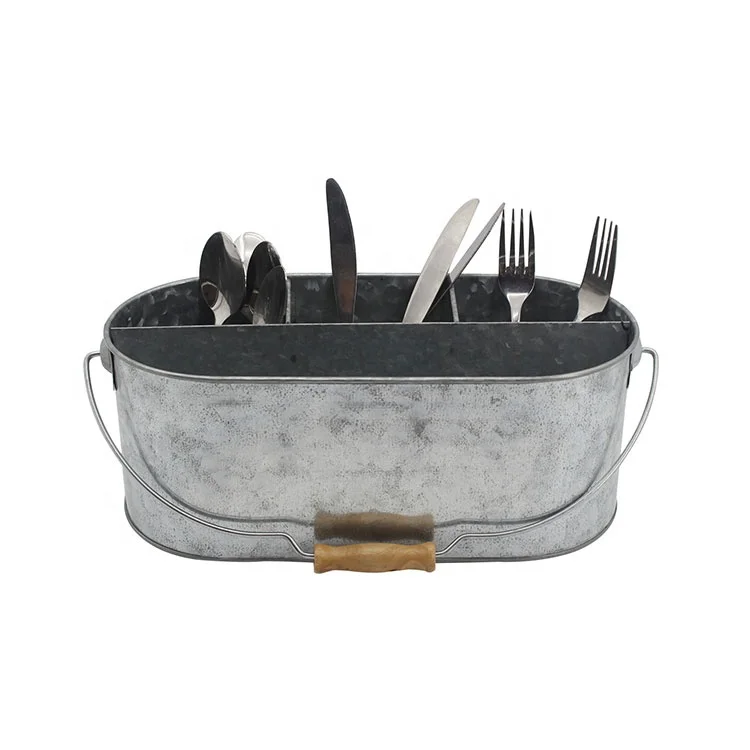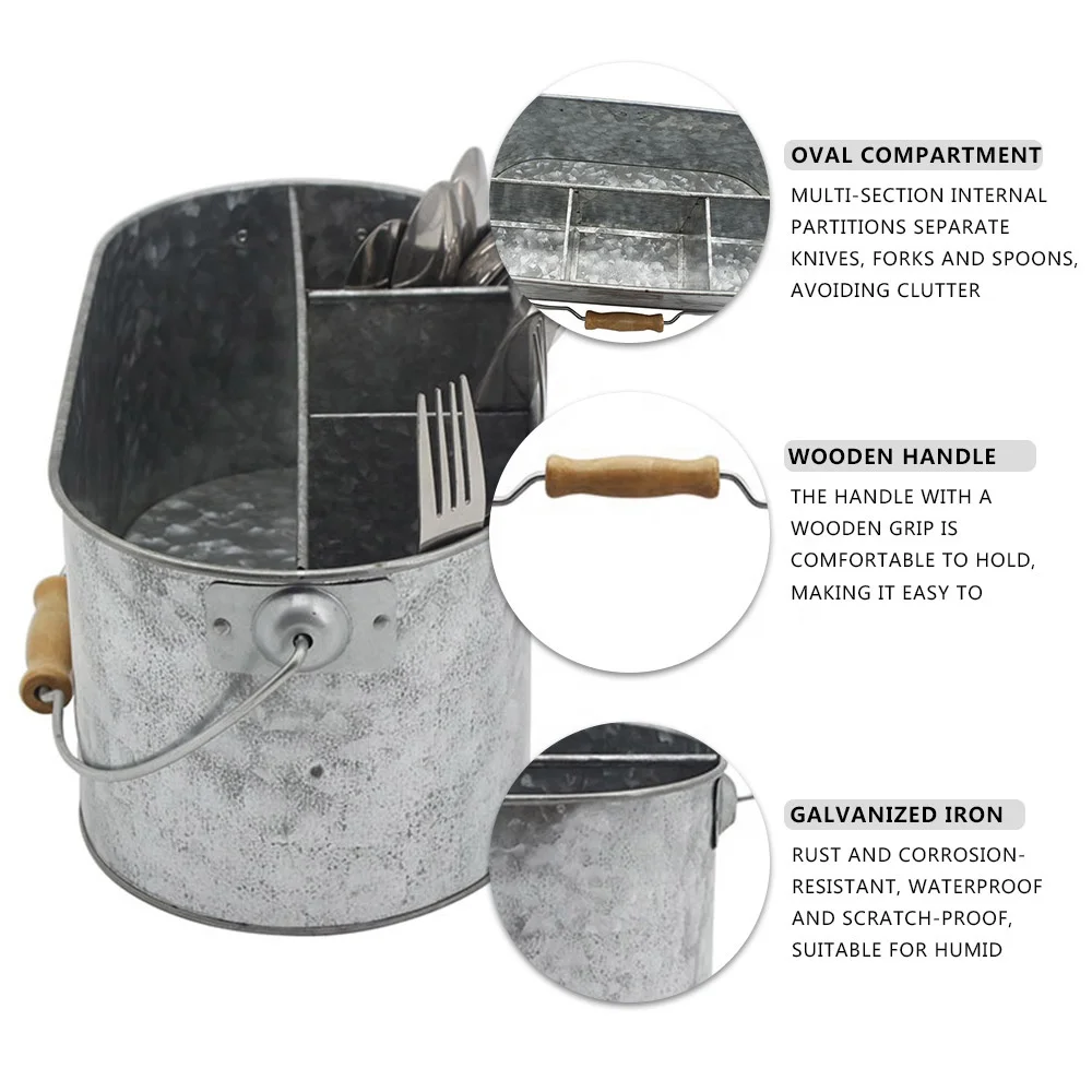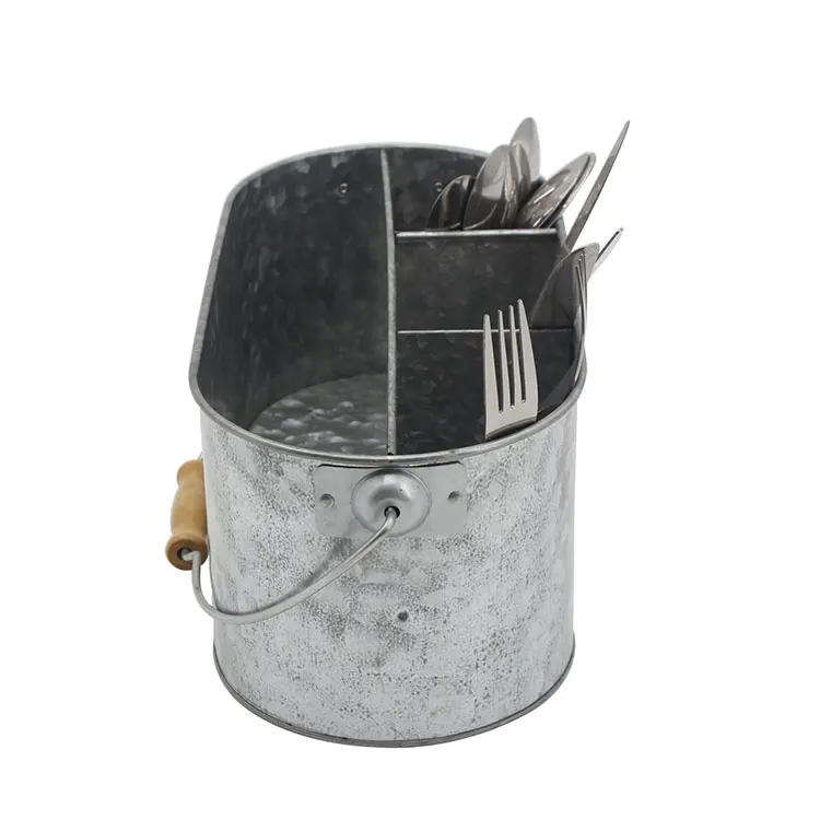 Galvanized Metal Utensil Caddy with Wooden Handle | Multi‑Section Organizer for Forks, Knives, and Spoons