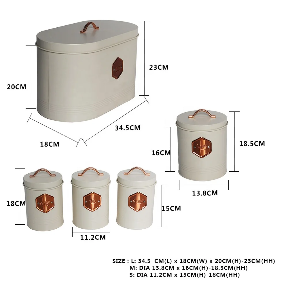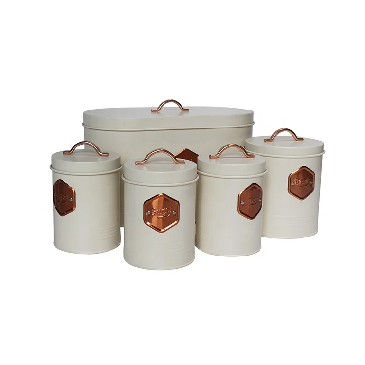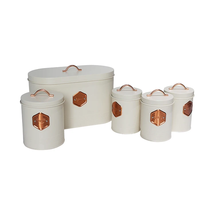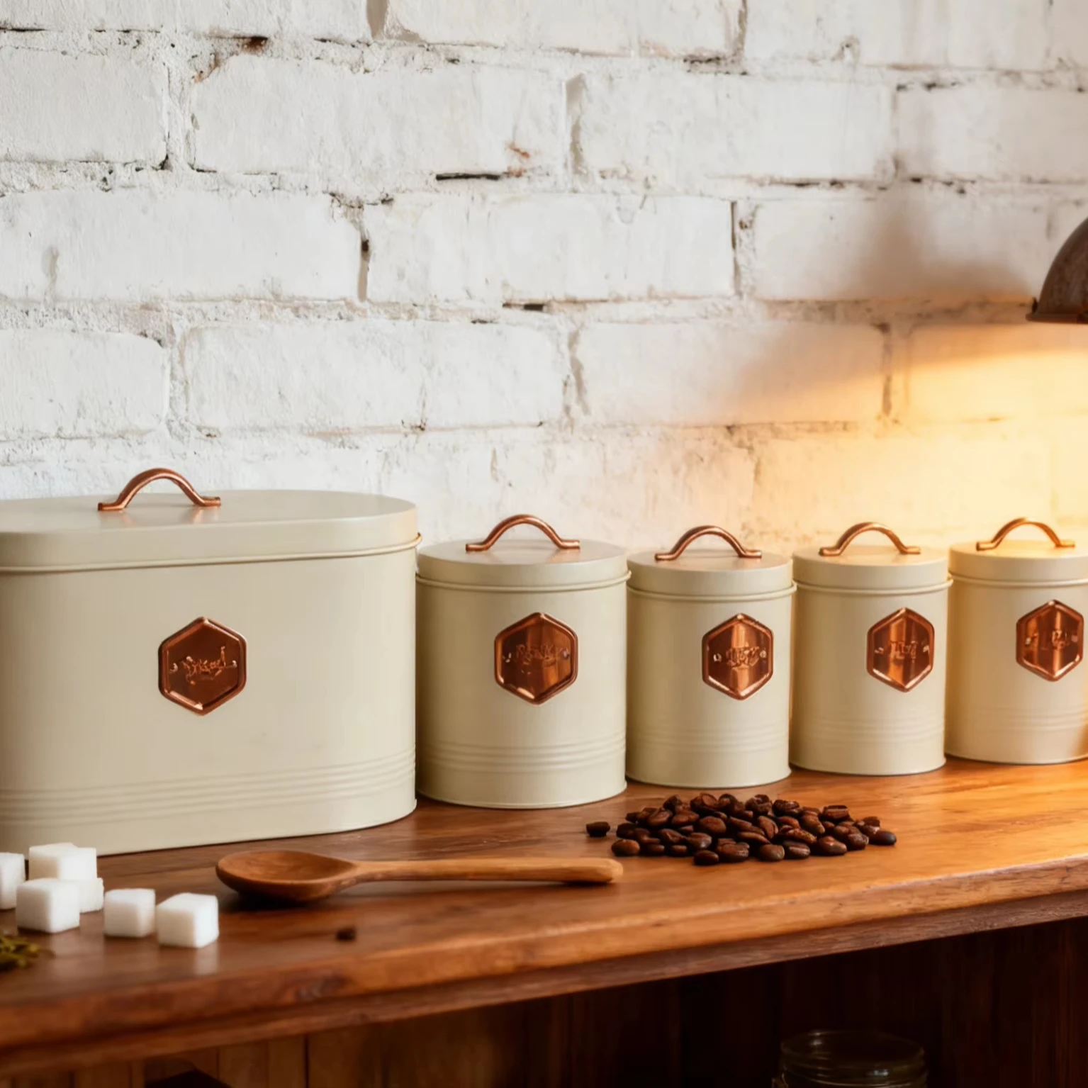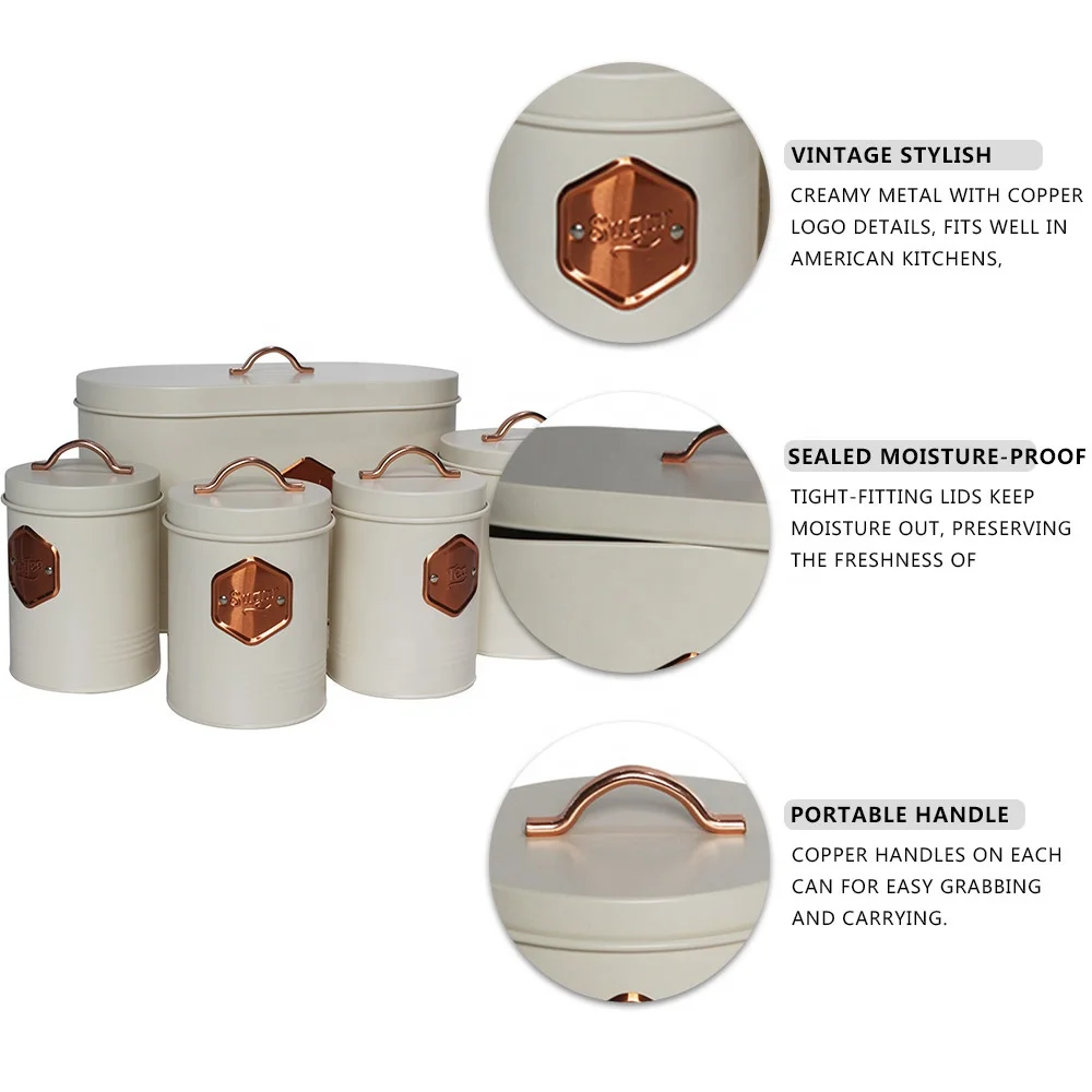 Vintage Cream Metal Kitchen Canister Set with Copper Handles and Airtight Lids