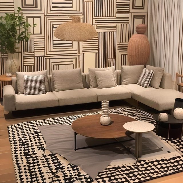 No living room is complete without the right ambiance. This space is enhanced by a geometric rug in black and white, which anchors the room with its bold design and luxurious feel. The wood slat wall in the background adds texture, drawing the eye upwards and creating a sense of depth. The pampas grass in a side vase introduces an organic element, bridging nature and modern design. Further adding to the space’s artistic touch are a large woven floor vase and strategically placed decorative objects. The elegant lighting fixtures cast a soft glow over the room, enhancing the cozy and inviting atmosphere.