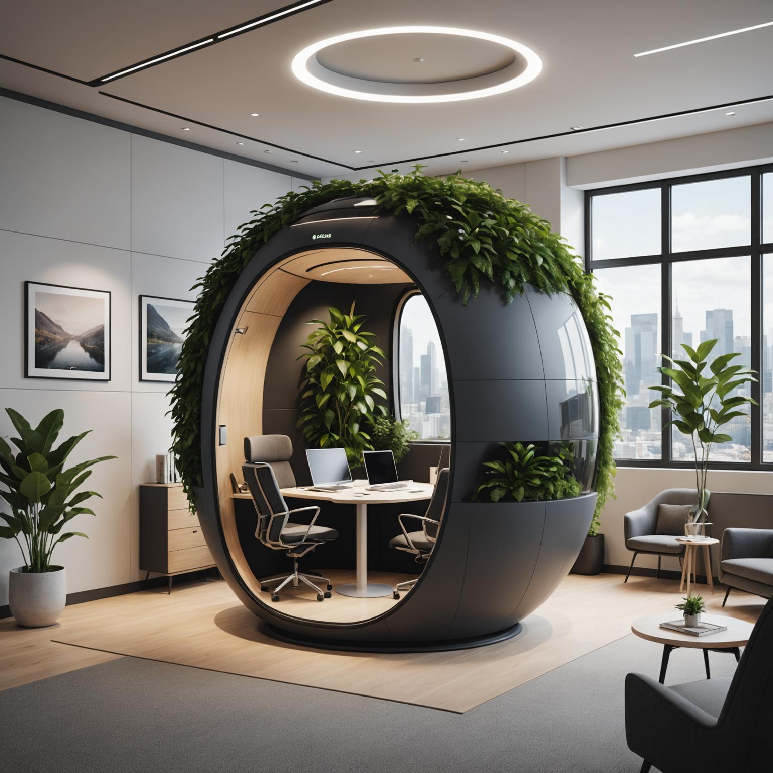 Step inside the WorkPod, where interior design meets futuristic functionality. Featuring vibrant yellow back panels, elegantly cushioned dual seating, and essential utility like connectivity ports beneath a central wooden table, this pod fosters an ergonomic environment. Whether collaborative meetings or private brainstorming sessions are in need, productivity within comfort is assured.